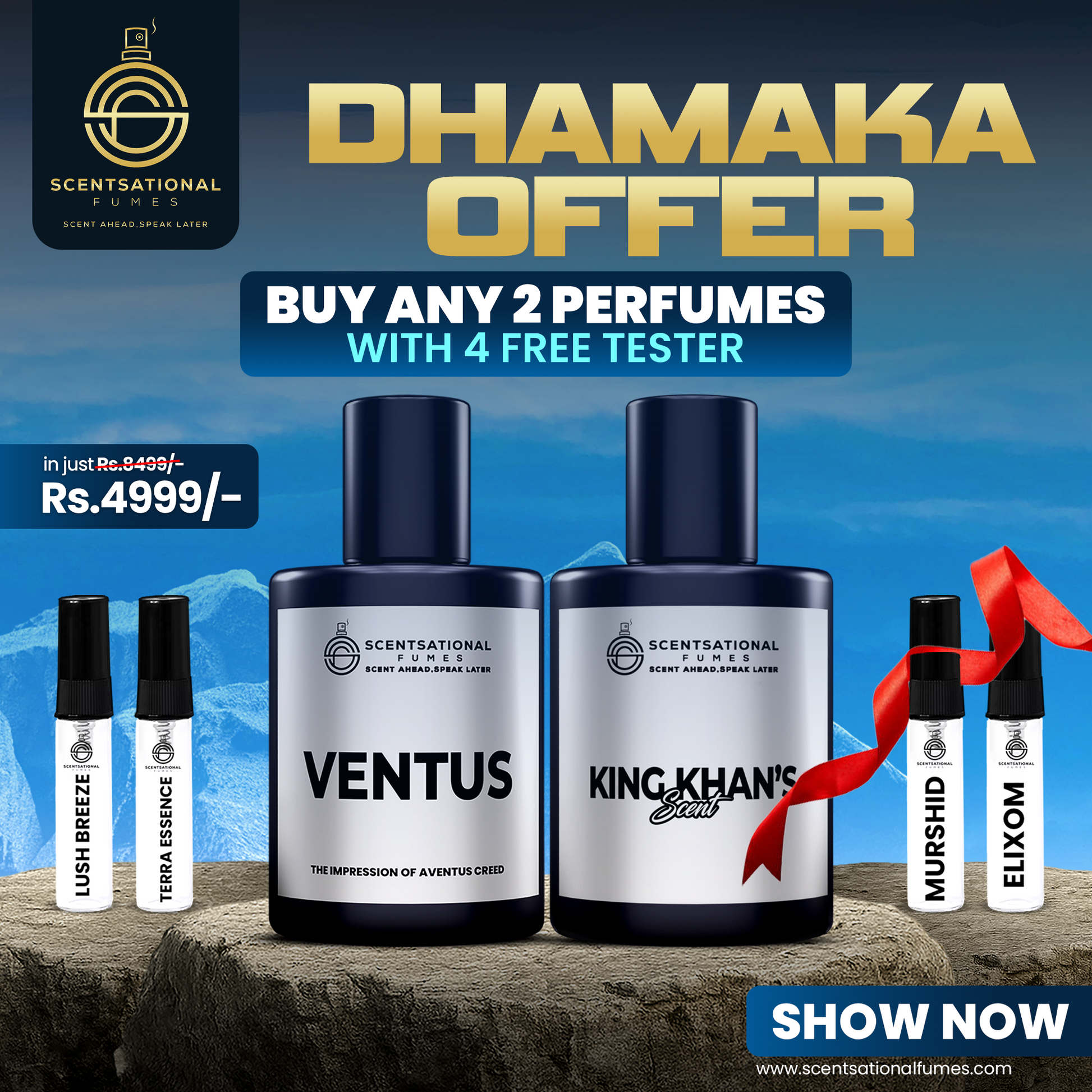 This bundle includes 2 Premium 50ml Perfumes, 4 Free 5ml Testers, a Luxury Gift Box, and Free Shipping.